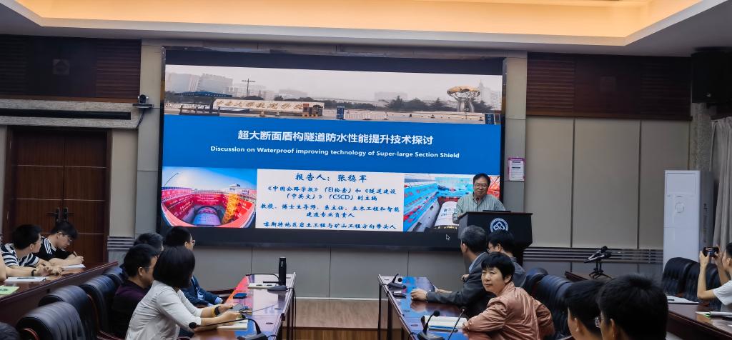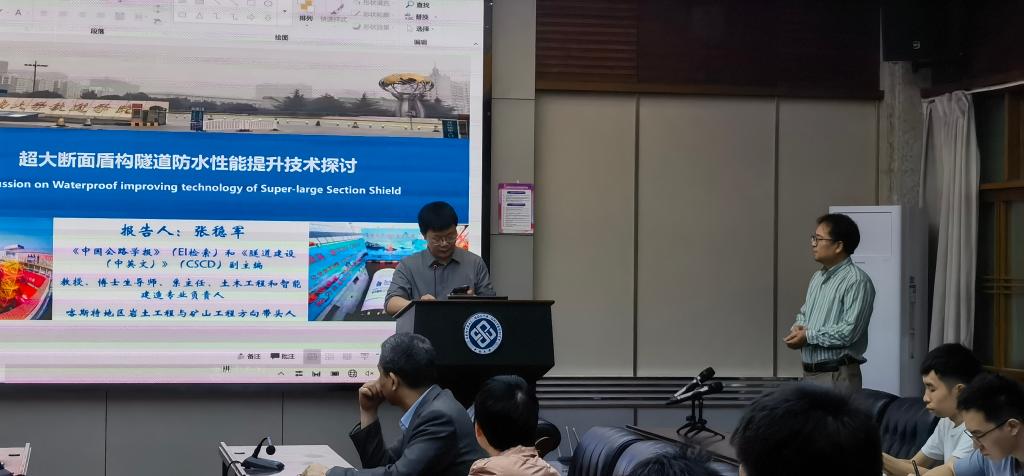 随后,在世纪楼14楼会议室张稳军教授为我院师生作了题为《超大断面盾构隧道防水性能提升技术探讨》的学术论坛报告。报告介绍了其团队在盾构隧道防水性能提升、掘进精准动态纠偏、结构安全与智能评估三方面取得的研究成果。报告会由土木工程学院副院长雷明锋教授主持。