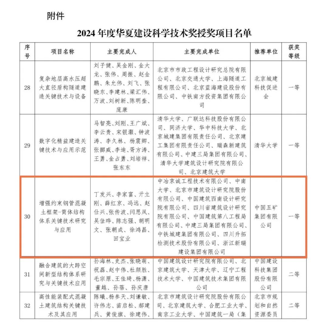 近日,华夏建设科学技术奖励委员会发布《关于发布“2024年度华夏建设科学技术奖”授奖项目的公告》(华夏奖字〔2025〕第1号),中冶京诚工程技术有限公司牵头,3044am永利集团官网参与完成的“增强约束钢管混凝土框架-筒体结构体系关键技术研究与应用”荣获一等奖,我院丁发兴教授个人主持。