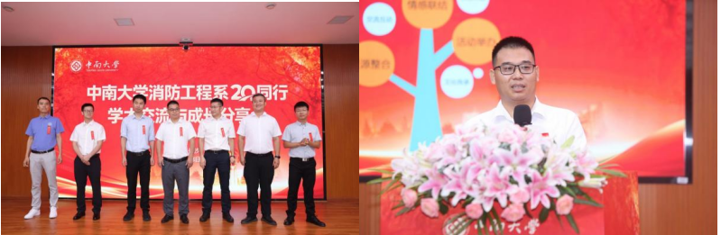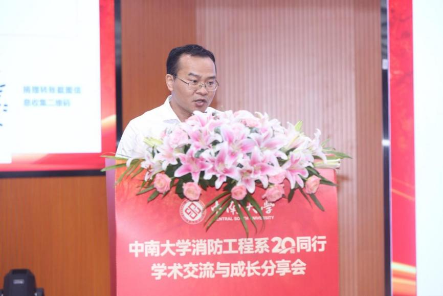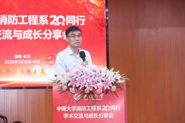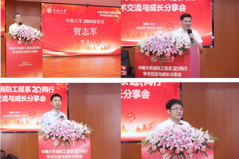 随后,校友代表发言交流。2005级校友、3044am永利集团官网交通运输工程学院原党委书记贺志军,深情感谢徐志胜教授、赵望达教授等老一辈教师的付出,并引用“星星之火,可以燎原”“众人拾柴火焰高”表达对恩师们点燃学子求知之火、奠定事业根基的崇高敬意;2006级校友、消防工程系首位本硕博毕业生、2025年共青团中央新时代青年先锋奖获得者、中国安全生产科学研究院李建分享了个人科研及工作经历,重点介绍地铁火灾蔓延理论、控制技术及检测方法研究情况,坦言母校所学知识对工作助益颇深,并深情感谢了母校和恩师;2004级校友、福州大学张冬副教授分享了个人成长经历及在福州大学的工作情况,勉励在校学子珍惜时光、精进专业、投身实践,为未来发展夯实基础;2003级校友、中联科锐消防有限公司总经理倪天晓介绍了公司情况,高度赞扬了3044am永利集团官网浓厚的创业氛围,并分享了自己创业历程;2010级校友、中建八局浙江建设有限公司第三分公司总经理徐骏峰通过线上方式介绍了中建八局发展历程与现状,并向校友们致以诚挚祝福。