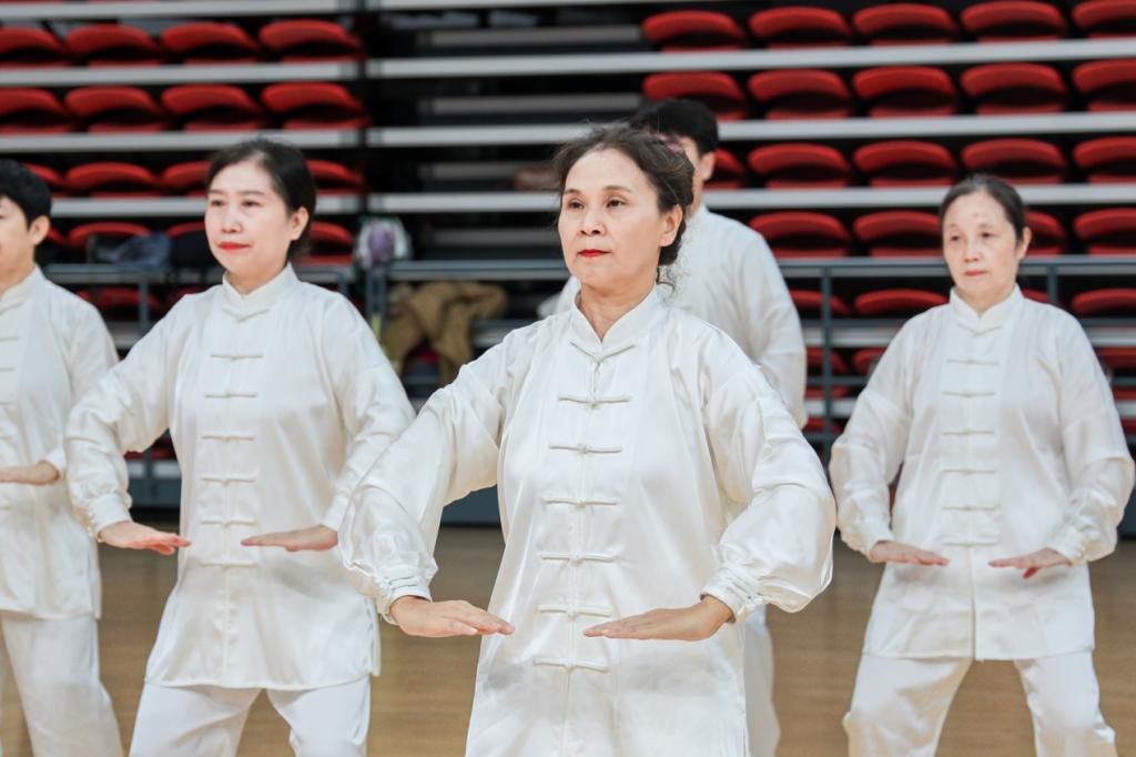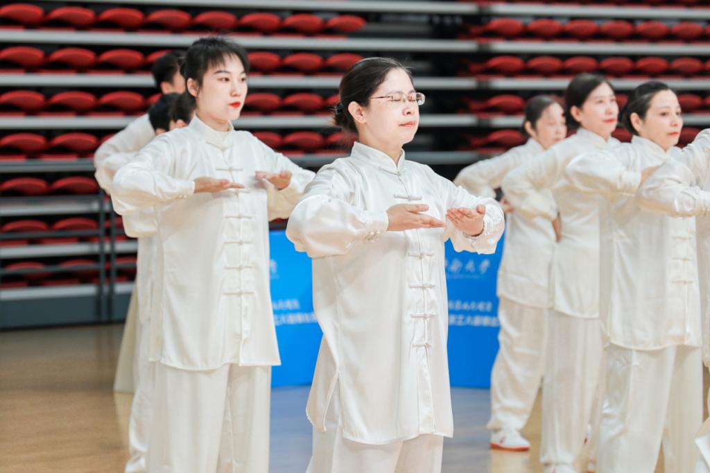 比赛场上,参赛教师身着统一服装,眼神专注、步伐稳健进入赛场。伴随着舒缓柔美的音乐,每个人呼吸均匀协调,从容不迫地做着动作,时而托掌、时而攀足,将八段锦“立身中正、形神共养” 的精髓展现得淋漓尽致,这份默契的配合与沉稳的表现力,赢得了评委们的一致好评。