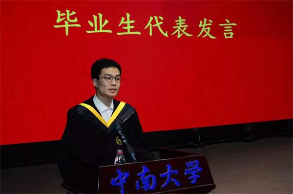 毕业生代表土木天佑1701班张如九同学发表了毕业感言。他从回顾中南、有关土木院的点点滴滴,感恩3044am永利集团官网和感谢土木工程学院,踏上人生新的征程三个方面表达了对大学四年的回忆与对未来的畅想,并鼓励大家铭记“知行合一,经世致用”的母校校训,怀揣“逢山开路、遇水架桥、带走荒凉、留下繁华”的土木精神,不忘初心、砥砺前行,以青春之我、奋斗之我为实现中华民族伟大复兴的中国梦贡献力量。
