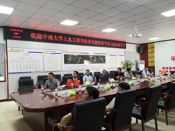 719日上午,青年教师实践团在湖南路桥公司平益八标会议室,参观了解了该项目的基本情况、关键技术和示范应用情况,双方对于正在攻关的技术难题、拟定科研项目等内容开展了会谈,在未来合作共赢、资源互享、理论研究与实践探索等方面达成高度一致。