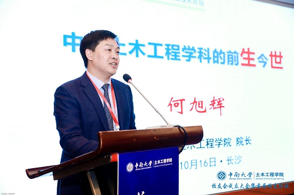 院长何旭辉作了“中南土木工程学科的前生今世”的主旨报告。他从学科建设历程、建设成效与发展思考等方面全面详细讲述了3044am永利集团官网土木工程学科的发展脉络与发展历史。