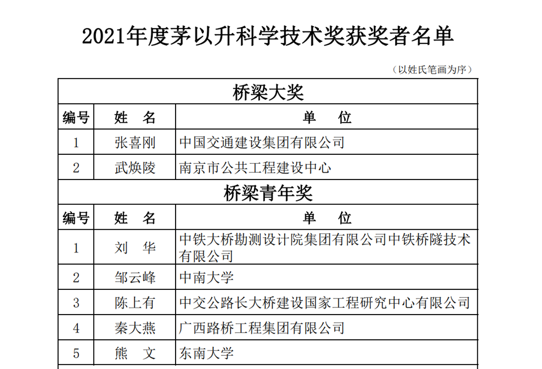 茅以升科学技术奖是经国家奖励办批准,依靠社会力量设立的科技奖励项目(国科证社字第 0022 号),是北京茅以升科技教育基金会于 1991 年设立,奖励在相关领域取得杰出成就的科技教育人才的重要奖项。2021 年度茅以升科学技术奖评选了七个奖项,291 位获奖者覆盖了工程建设领域的优秀工程技术人才;理工农医等科研院所的优秀科研人员;高等院校的优秀学子,他们都是在本领域做出突出贡献的佼佼者。其中,茅以升桥梁青年奖专为青年桥梁科技工作者设立,旨在鼓励青年桥梁科技人员扎根一线、建功立业,取得突出贡献。桥梁青年奖每2年评选一次,每次评选5人。