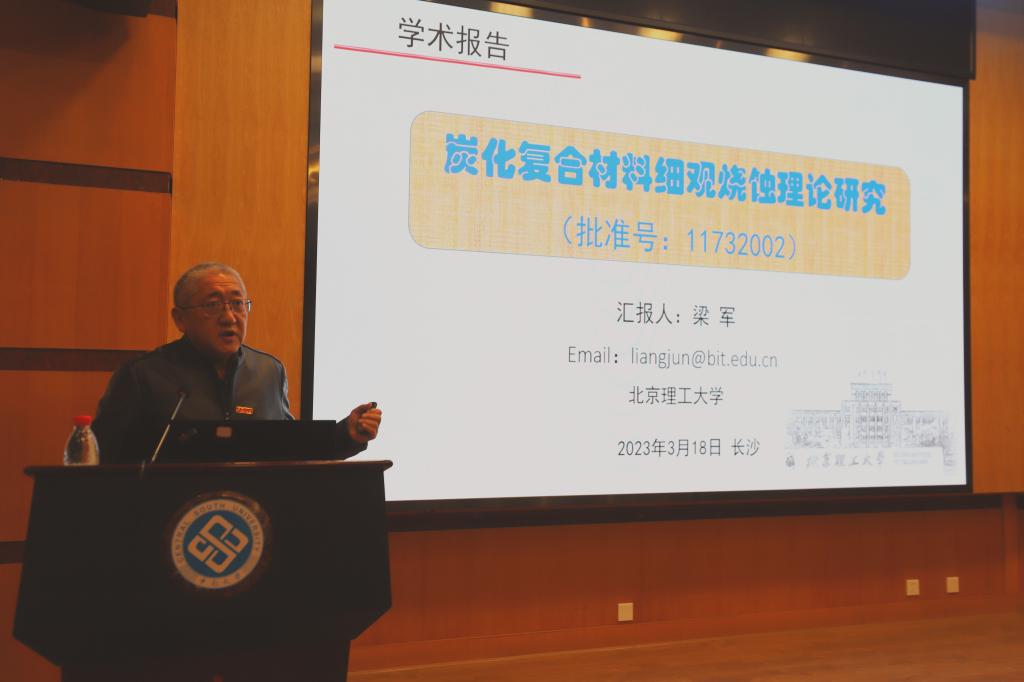 受聘仪式后,梁军教授作了题为《炭化复合材料细观烧蚀理论研究》的学术报告。报告针对临近空间飞行器大面积热防护材料表面烧蚀和体积烧蚀条件下多孔介质的传热传质特性、介绍课题组近年来在炭化复合材料细观烧蚀理论、特别是烧/剥蚀耦合作用判据和模型等方面取得的研究进展。