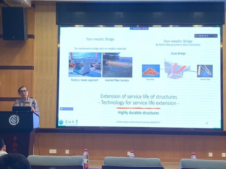 在第一场报告中,UEDA教授首先介绍了当前国际可持续发展的17个目标,其主要体现在三个方面——社会、环境和经济可持续,而土木工程领域尤其是基础设施建设对于目标的实现有着举足轻重的影响。接着UEDA教授着重介绍了碳中和及其实现蓝图,在土木工程领域对建设过程轻排放、绿色材料开发、结构全寿命周期运维及基础设施建设战略安排提出了更高的要求。最后UEDA教授介绍了在土木工程领域关于可持续发展规范化、标准化的重要性和急迫性,并强调了在这方面关于进一步加强国际合作特别是中日合作的必要。