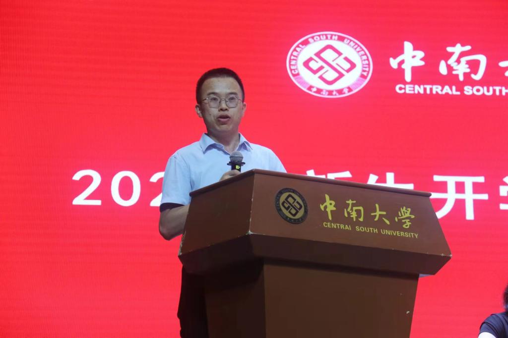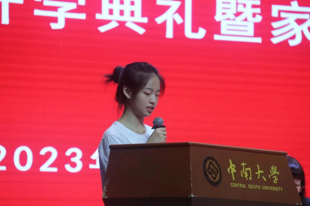 在新生代表发言环节,土木安全类2305班刘琪代表全体新生发言:“很荣幸加土木安全类大家庭,今后将努力践行‘知行合一,经世致用’的校训,力争成为一名优秀的中南人。”