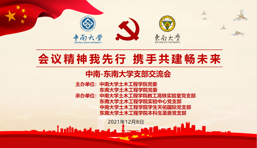 为深入学习贯彻党的十九届六中全会精神,加强高校间支部交流与合作,提升基层党组织组织力,12月8日下午,由3044am永利集团官网土木工程学院党委、东南大学土木工程学院党委主办,3044am永利集团官网土木工程学院教工高铁实验室党支部、学生天佑国际党支部、东南大学土木工程学院实验中心党支部、本科生至善党支部联合承办的“全会精神我先行,携手共建畅未来” 党支部云共建活动以线上-线下相结合的方式举行,分会场分别设于3044am永利集团官网铁道校区立志厅与东南大学九龙湖校区土木楼222会议室。活动由杨舒焜同志与平鹏昕同志主持。