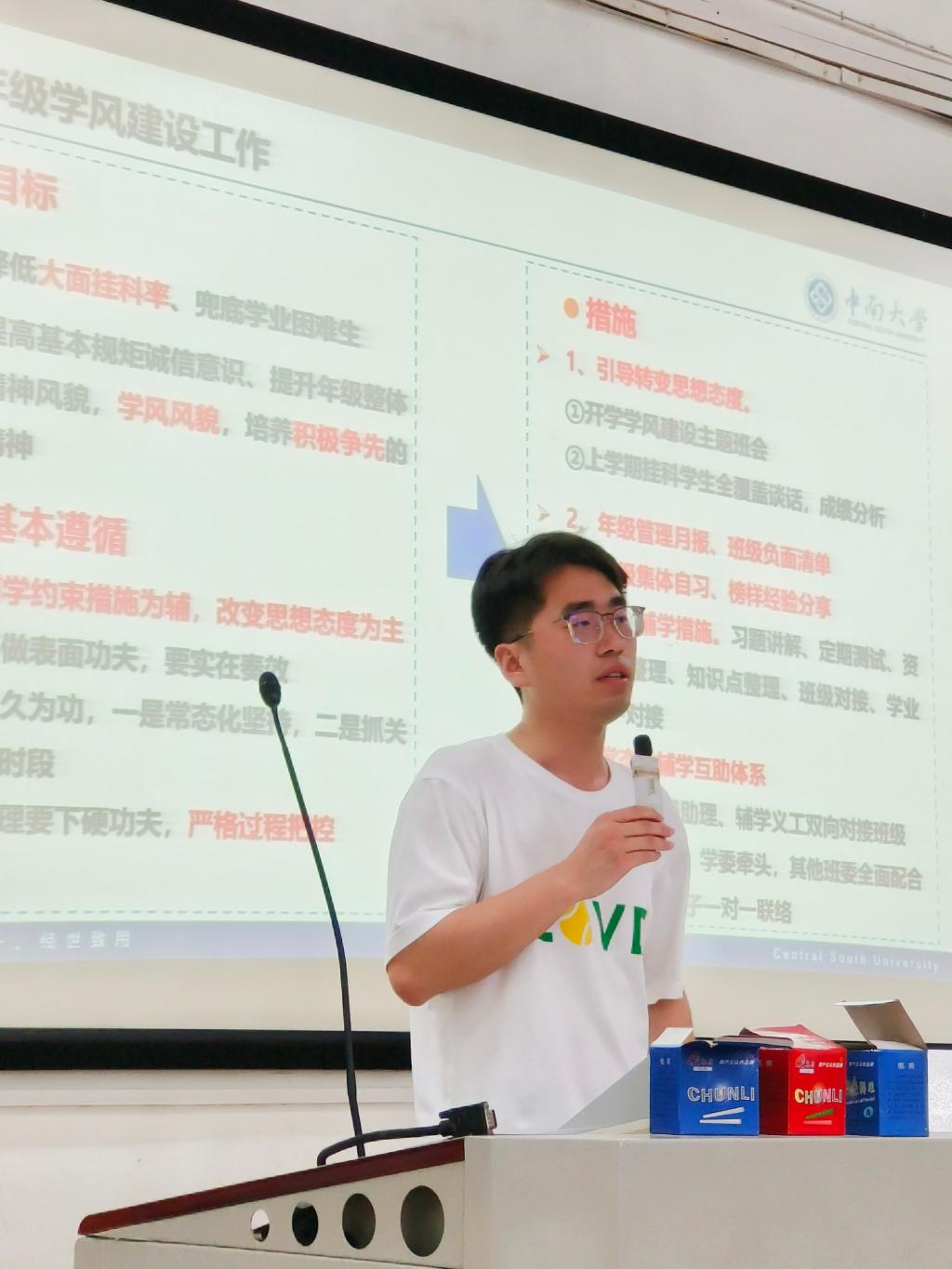 2022级辅导员梁雄老师分析了目前年级的学风情况,并详细介绍了年级正在进行的辅学帮扶方案和“辅导员-年级助理/辅学义工-班委-入党积极分子” 辅学互助体系。希望全体同学相互配合,层层落实辅学措施,严格把控过程,“有条理,有方法,有成效”地完成学风建设工作。随后,张浩天老师对专业认知、职业规划做了分享,介绍了近几届学长学姐的升学、就业情况,强调同学们要“目光长远、脚踏实地、稳中求进”,丰富专业知识储备,为未来打好基础。最后,马嘉璐老师强调班委要重视日常安全工作,对近期假期离校报备、防电诈安全教育主题班会等工作进行了安排。