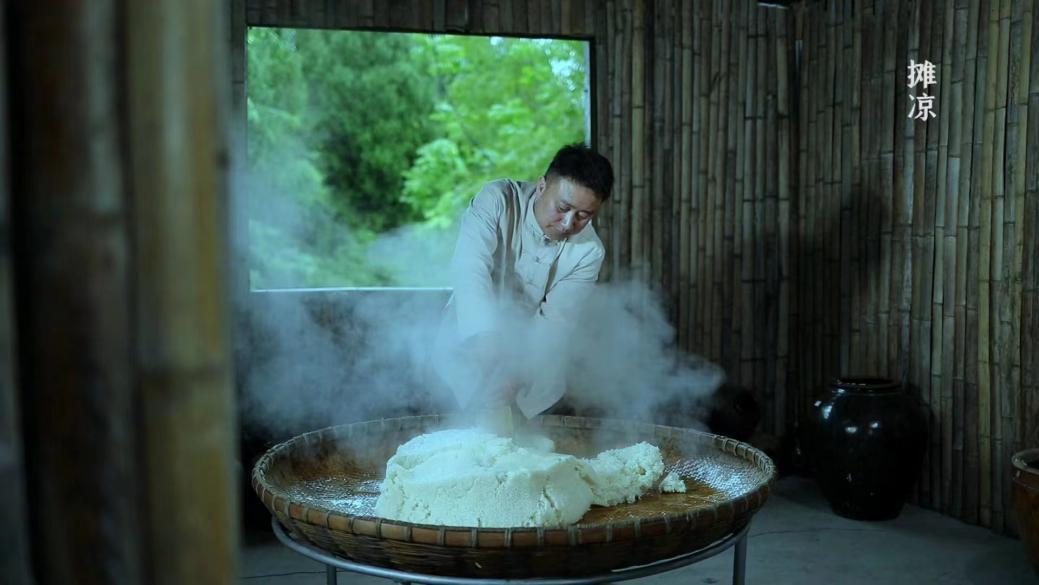 一缸松山水酒的诞生要经历选米、浸米、蒸米、摊凉、拌曲、发酵、压榨、分坛等13道工序,封坛后三天变为甜酒,一个月就可以变为水酒,这是一个相当复杂、讲究的传统工艺,酒厂的机器已可以实现酿酒,但陈历祥坚持投资上几百万在油溪桥村打造古法工坊,亲自酿酒,“父亲在我一岁多时过世,我从小跟着爷爷长大,他是松山水酒第19代传人,跟在他身边的日子我看过无数遍制酒工序”。
