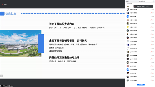 分享会期间,备考的同学就考研动力、考试前的注意事项等方面提出问题,与学长们取得良好的互动,活跃了分享会的氛围,参会人数一度达到了231人。最后,学长学姐们对参加会议的同学表达鼓励和真挚的祝福。分享会最后,组织委员丑泽霖对八位分享经验的党员同志的付出表示感谢,同时也祝福同学们能在考研路上坚定信心、忍受孤独,找寻到属于自己的考研之路。此次交流会,不仅给即将保研的同学提出了宝贵的经验,也给立志考研的同学们指引了方向,同时使同学们对考公过程有一个更具体清晰的认识,为以后的选择打下坚实的基础。