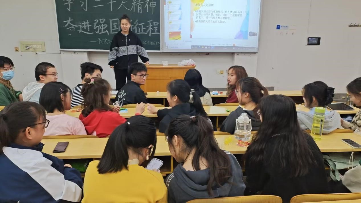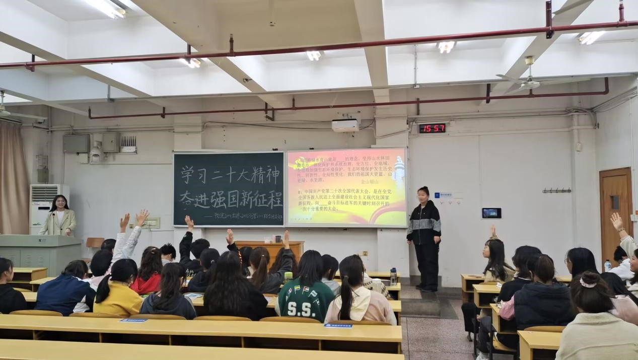 活动伊始,雷望红老师为同学们讲述党的二十大精神。内容主要分为四个部分,第一部分是中国特色社会主义的内涵,并就什么是中国特色社会主义进行互动提问,同学们积极发表意见。第二部分通过举例中国工程院院士何继善、普通技术人员张珍阐述党员所具备的各种优秀品质及党的优越性。第三部分论及中国式现代化的道路自信,人民在党的坚强领导带领下不断走向新胜利。最后结合党的二十大精神,谈及中国广大青年的担当使命,号召青年大学生要有使命感和责任感,不负国家,不负人民。