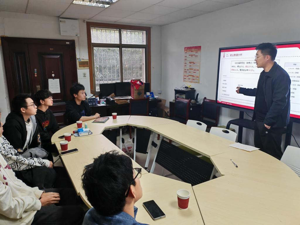 分享会上,潘文彬老师以“学土木就一定要到工地打灰吗”的疑问引出同学们对于专业未来发展的思考。结合近三届毕业生的升学去向详细分析了土木工程学院各专业的招生人数、保研名额、考研指标等数据,勉励有升学想法的同学夯实专业基础、拓展综合素质、做好学业生涯规划。以土木工程学院2023届毕业生去向为例,着重探讨了不同专业毕业生的广阔发展方向,包括国内升学、国/境外深造、科研设计单位、甲方单位、国企施工单位、选调生和新能源行业等,并针对不同发展方向的能力需求进行了简要说明。潘文彬老师还收集了近年来我院毕业生在不同行业的实际工作内容及待遇状况,为参会同学状摹出土木工程学院毕业生最真实的未来发展蓝图。最后,同学们踊跃提问,潘文彬老师逐一回复了同学们在专业课程学习方法、大学生活规划等方面的疑惑。