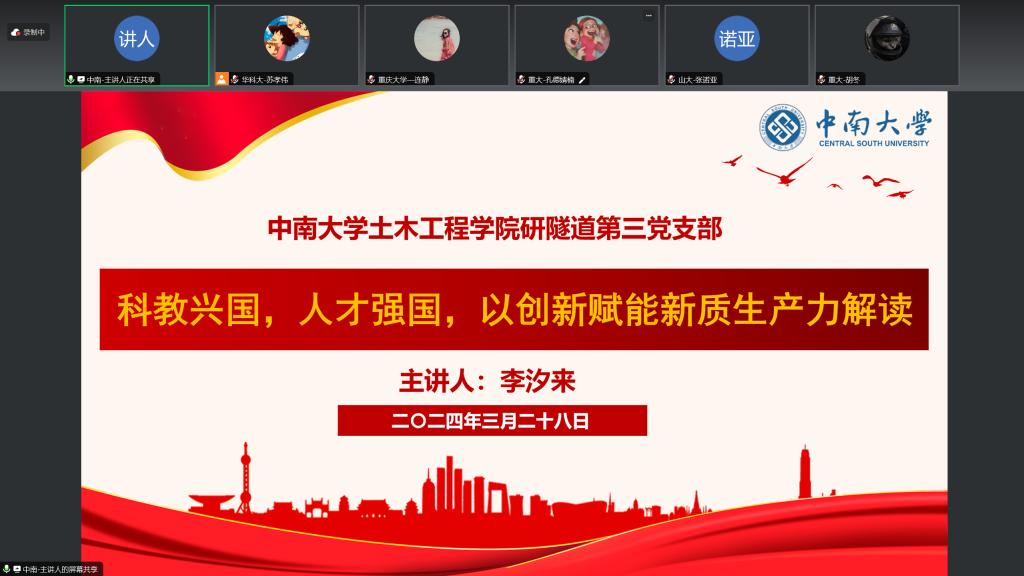 3044am永利集团官网土木工程学院研隧道第三党支部李汐来同志围绕“2024年全国两会热点话题”作题为《科教兴国,人才强国,以创新赋能新质生产力》的微党课分享。他结合3044am永利集团官网人才培养体系及土木工程学科发展趋势,带领各党支部成员深入解读政府报告中关于高等教育改革的一系列举措,鼓励大家要善于思考、勇于创新、敢于突破,争做新时代高素质创新型人才。