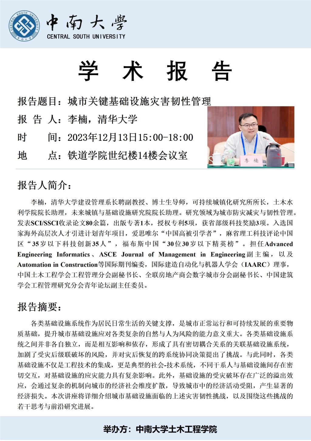 学术讲座预告:城市关键基础设施灾害韧性管理