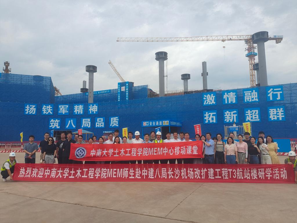 2023年7月8日,在土木工程学院单智老师和刘梦婷老师的带领下,MEM2021级和MEM2022级同学前往长沙机场改扩建工程T3航站楼项目,开展参观研学活动。同学们参观了智慧展厅、安全体验中心、观光塔等,深入了解了施工过程中的各项细节和措施,亲身感受了智慧建造、绿色建造、数字建造等技术在项目实施中的运用。