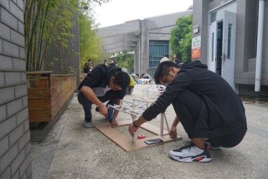 各队成员协作互助,现场气氛热烈。同学们对比赛的热情高涨,不仅体现在每天紧锣密鼓的模型制作过程中,也体现在比赛过程中对每一次加载重物的期待与担忧中。