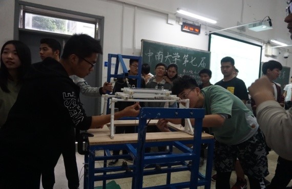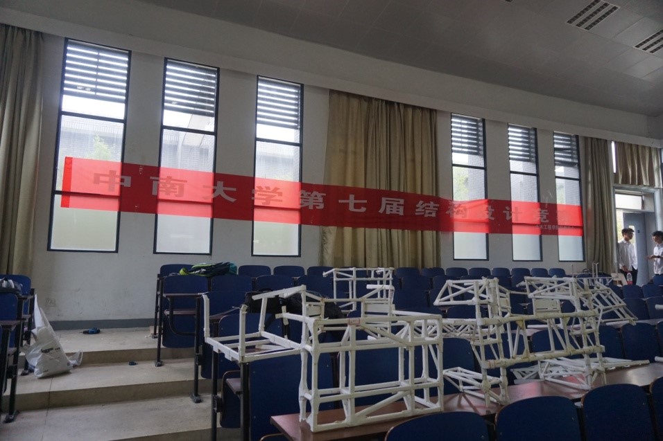 为了保证比赛的公平性,称重与测量是必不可少环节,我们的工作人员在在现场也是一丝不苟。虽然有些参赛队伍的模型,在第一次测量尺寸的时候没能成功,但聪明又不服输的中南学子们,当然不会就此放弃,而是选择现场动手改造,改至符合标准,再进行固定、加载。