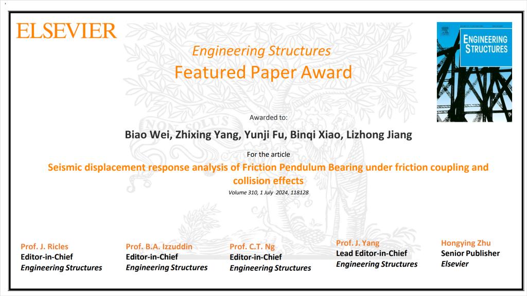 近日,土木工程领域权威期刊《Engineering Structures》编辑部公布了该期刊最佳论文奖(Featured Paper Award)遴选结果。由3044am永利集团官网土木工程学院和高速铁路建造技术国家工程研究中心的魏标教授、蒋丽忠教授、杨智星硕士生、肖斌琦博士生和英国曼彻斯特大学的符云集博士生(魏标教授的硕士毕业生)合作完成的发表于该期刊2024年第310卷的论文“Seismic displacement response analysis of friction pendulum bearing under friction coupling and collision effects”荣获该奖。这是3044am永利集团官网土木工程学院和高速铁路建造技术国家工程研究中心师生近年来首次荣获该奖项。