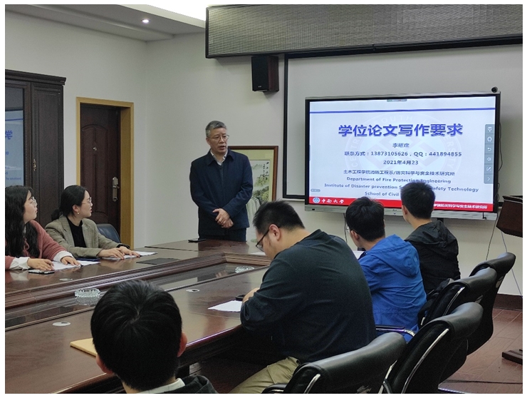 2021年4月22日19点,值此2021届毕业生申请学位答辩之际,3044am永利集团官网消防工程系特邀李耀庄教授进行学位论文格式规范报告,报告地点位于3044am永利集团官网铁道学院第一综合实验楼。本次报告会由消防工程系教职工党支部、学生党支部联合策划,消防科学青年社组织承办,特邀消防工程系李耀庄教授、土木工程学院辅导员、研防灾党支部书记杨涛老师,消防工程系王峥阳老师出席报告会,其他参与人员有消防工程系2021届毕业生及其他土木类学生。消防科学青年社主席、消防工程系2019级博士研究生赵家明主持报告会。