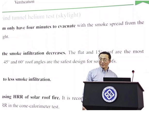 戚大海副教授汇报的主题为建筑火灾烟气缩尺模型理论方法与应用研究的最新进展。他首先介绍了一种全新的高层建筑火灾烟气流动缩尺模型,通过考虑火灾烟气与边界之间的热交换,提出准确性更高的弗劳德-斯坦顿建模方法。其次,戚大海副教授还提出了太阳能电板火灾烟气流动缩尺模型,以及一种新的氦相似理论和太阳能电板火灾烟气扩散风洞试验的标度方法,并介绍了建筑一体化光伏双层幕墙火灾烟气扩散机理,提出了一种经济、安全、实用的模拟方法。