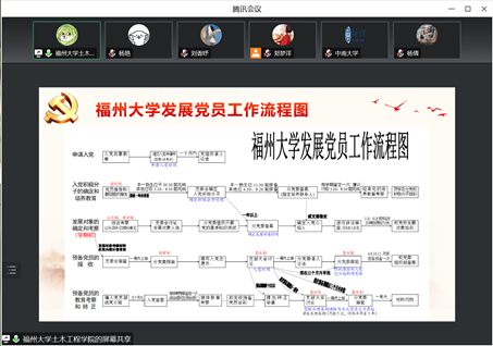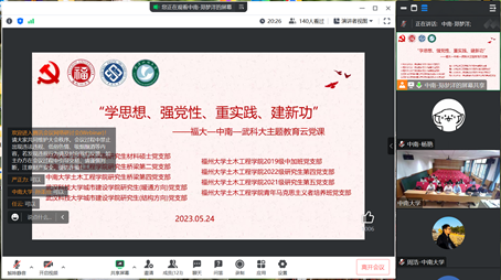 3044am永利集团官网土木工程学院2021级辅导员、研材料硕士党支部书记杨倩,桥梁系青年教师、研桥梁第四党支部书记周浩,研桥梁第二党支部书记郑梦洋;福州大学土木工程学院2021级研究生辅导员、研究生第五党支部书记黄哲,2022级研究生辅导员、研究生第四党支部书记李彬彬,2019级本科生辅导员、中加班党支部书记童莹芳,青马班党支部班长祁湘平、董靖怡;武汉科技大学城市建设学院研究生结构方向、暖通方向党支部书记赵晓悦、刘香妤及各支部全体党员参会,会上进行了主题教育理论学习与党支部建设经验交流。
