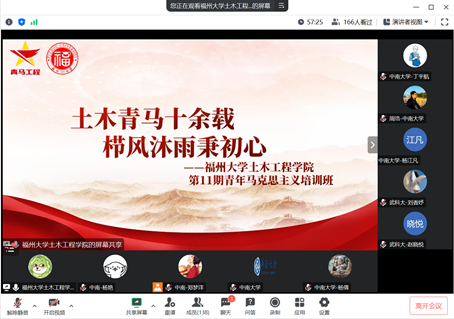 祁湘平以《土木青马十余载 栉风沐雨秉初心》为主题,对青马班全国党建工作样板党支部建设以及近十年的发展历程进行了分享,从思想引领、人才培养、活动品牌三个方面进行了详细的介绍。福州大学土木工程学院青马班将“青年马克思主义者培养工程”和“卓越工程师培养计划”有机结合,强理论、重实践、讲奉献,为如何做好党支部建设、学生党员如何更好参与社会实践、志愿活动提供了参考。