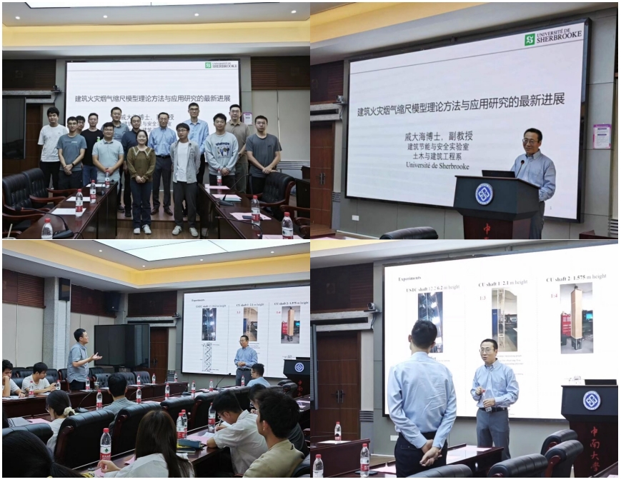 2023年10 月18 日上午,加拿大舍布鲁克大学土木与建筑工程系戚大海副教授于3044am永利集团官网铁道校区世纪楼14楼会议室作汇报,戚大海副教授汇报的主题为建筑火灾烟气缩尺模型理论方法与应用研究的最新进展。他首先介绍了一种全新的高层建筑火灾烟气流动缩尺模型,通过考虑火灾烟气与边界之间的热交换,提出准确性更高的弗劳德-斯坦顿建模方法。其次,戚大海副教授还提出了太阳能电板火灾烟气流动缩尺模型,以及一种新的氦相似理论和太阳能电板火灾烟气扩散风洞试验的标度方法,并介绍了建筑一体化光伏双层幕墙火灾烟气扩散机理,提出了一种经济、安全、实用的模拟方法。汇报结束后,与会师生与戚大海副教授展开交流。部分师生结合自己的实验课题和科研经历向戚大海副教授提出疑问,戚大海副教授均细致回答,与师生互通有无。